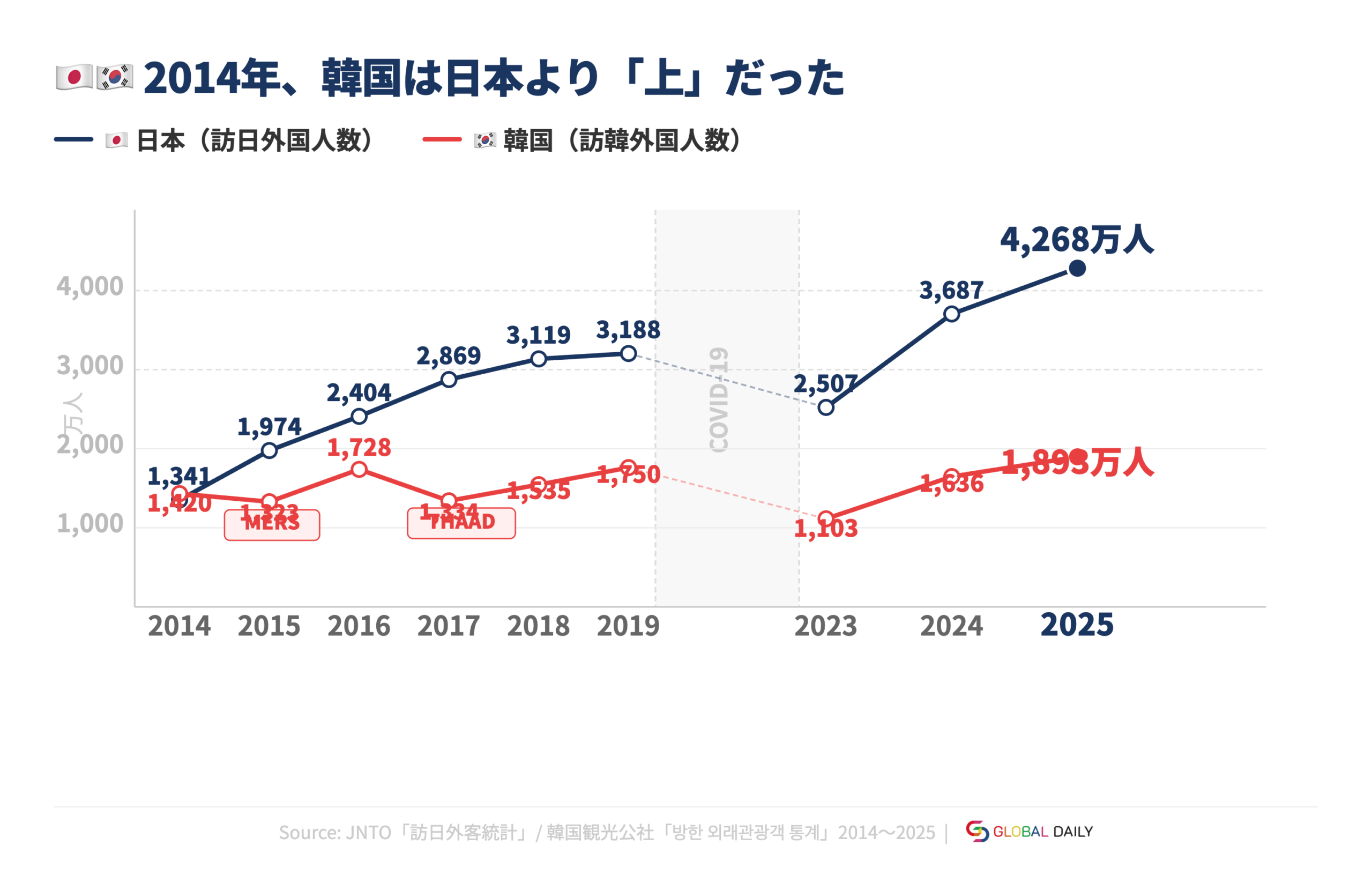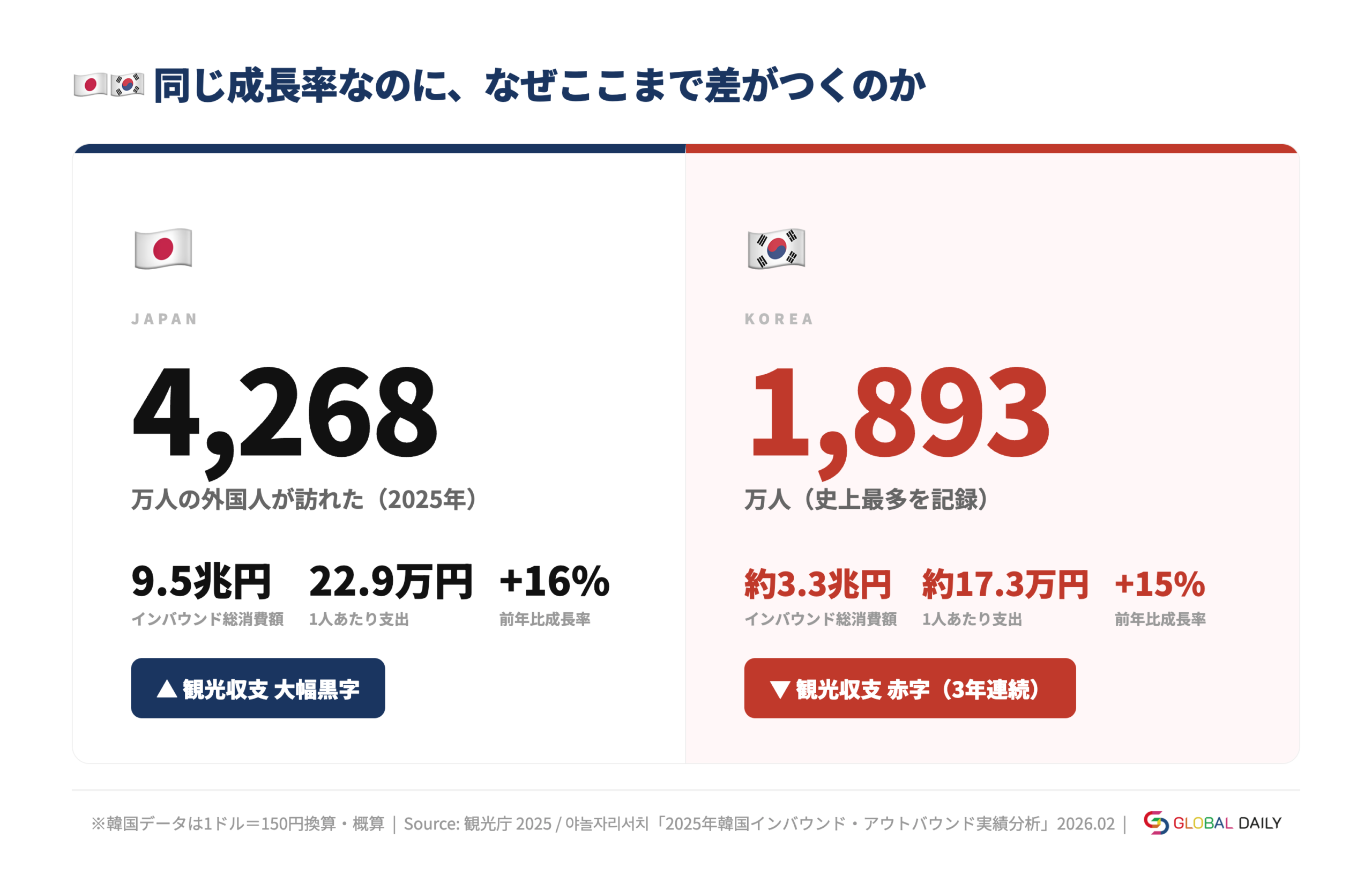一方、韓国も2025年に訪韓外国人数が史上最多を記録し、見た目の成長率だけを並べれば「どちらも好調」に見えます。
