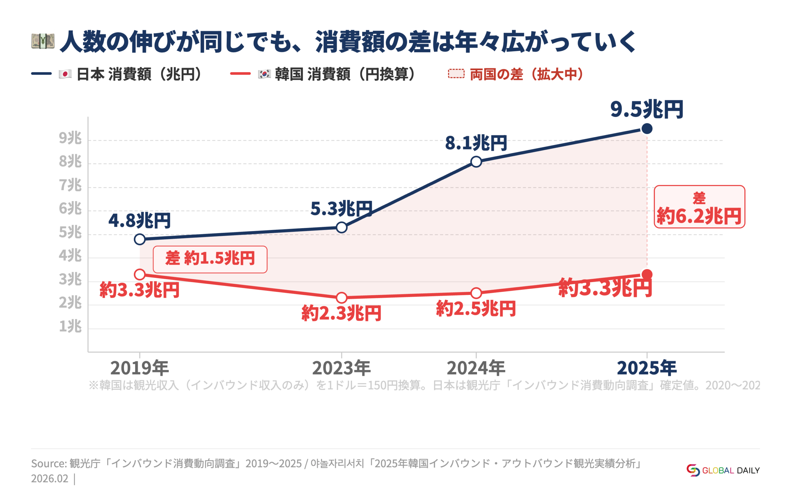 日本のインバウンド消費は2025年に9.5兆円規模まで伸びました。一方で、国籍別に見ると「人数が最大でも単価が伸びにくい市場」が存在します。代表が訪日韓国人です。