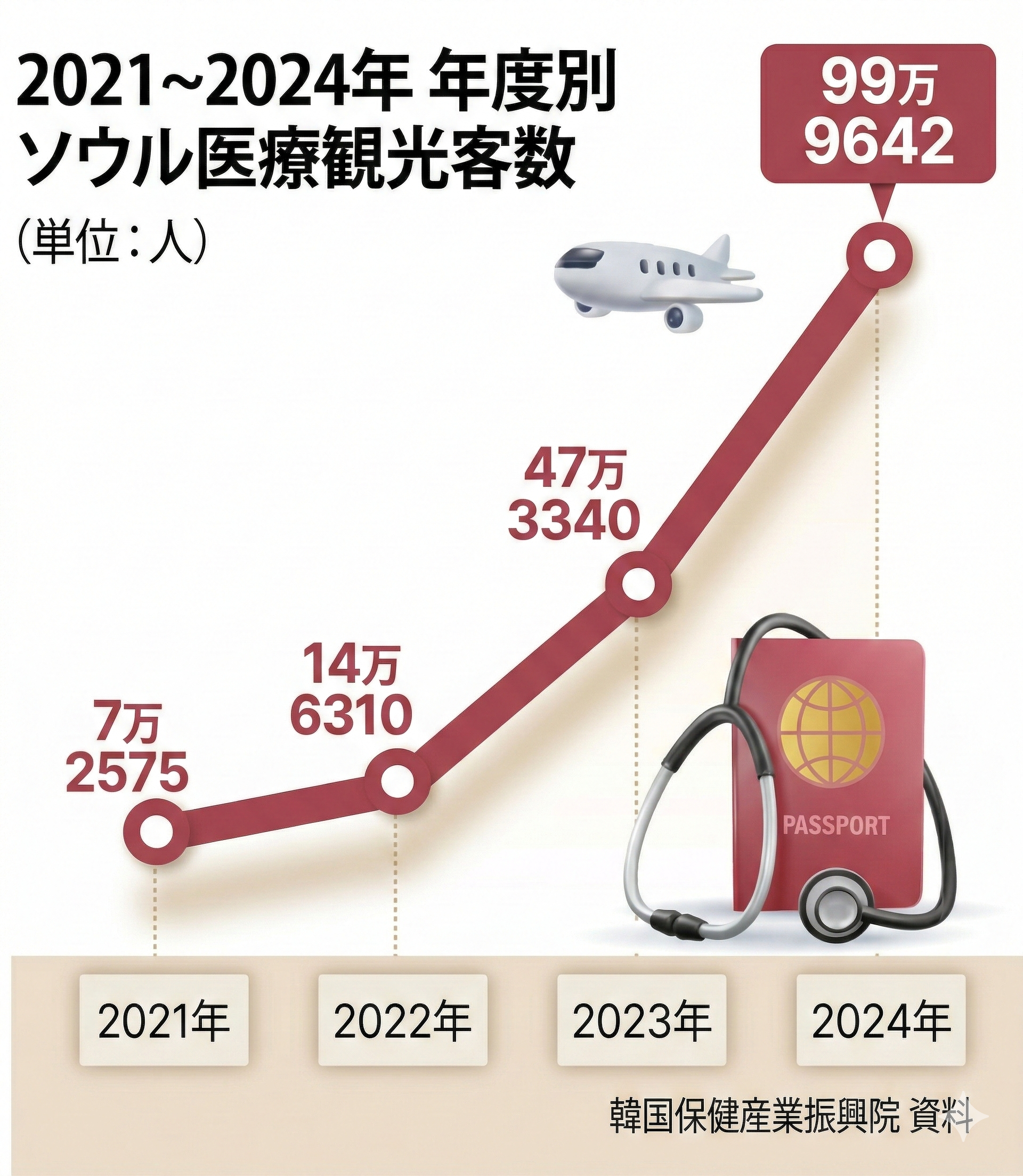 報告書が示すポジティブな変化も重要です。下半期に入って1人当たり支出が2019年比で小幅プラス(+2.4%、+3.1%)へ転じたとされ、その牽引役として医療観光が挙げられています。外国人の医療消費は2019年 3,939.6億ウォン → 2025年 約2兆796億ウォン(5.3倍)。