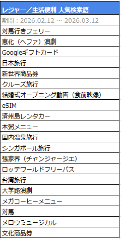 今回、NAVER DataLabにおけるNAVER SHOPPPING部分の「レジャー/生活便利」カテゴリの人気検索語をもとに、2026年2月12日から3月12日までの約1か月間に韓国ユーザーがどのような旅行・レジャー関連のキーワードを検索しているのかを分析しました。
