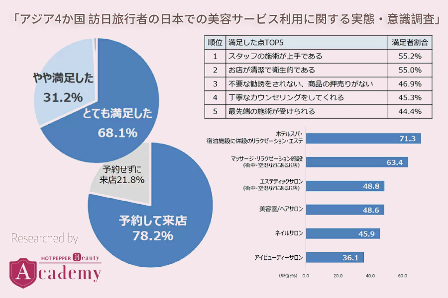 また、直近の日本旅行で、美容関連サービスを利用した旅行者のほぼ全員がサービスに「満足した」と答えており、満足した点としては「施術が上手」「清潔で衛生的」が上位を占め、利用した美容関連のお店・サービスの情報源は、「日本に来てネットで調べた」「自国内で事前にネットで調べた」「宿泊施設の紹介・チラシ」が5割に達しています。
