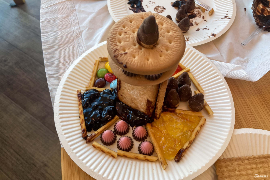 ジャムやチョコレートスプレッドを接着剤代わりにして、お菓子をデコレーションしていきます。